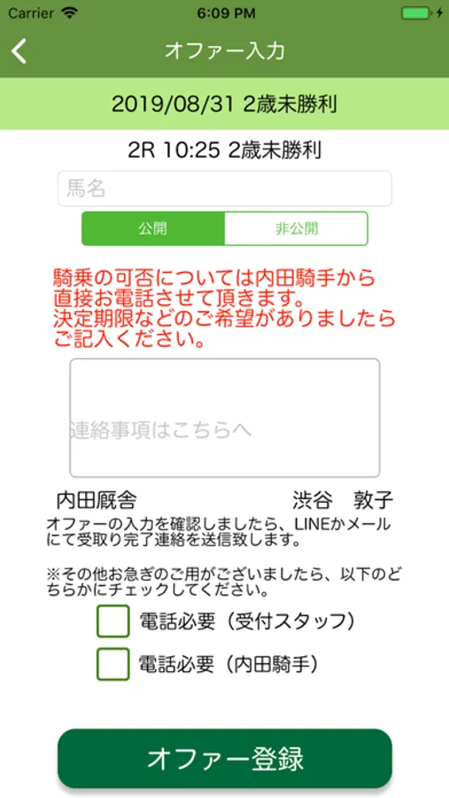 ご依頼をいただく際、お伝え頂く注意事項などがあれば、コメント欄にお書きください。お電話の欄にチェックして頂ければ、内田騎手からお電話させていただきます。
