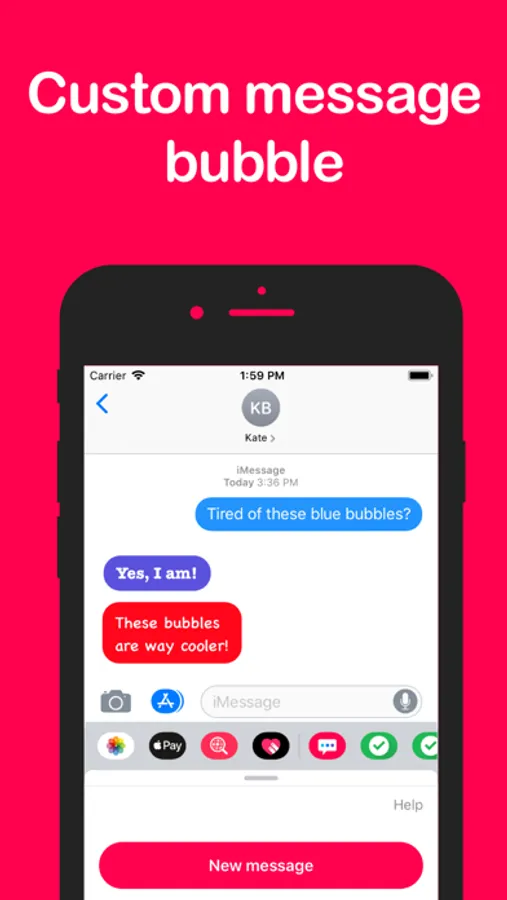 To use the app, open an iMessage conversation. Tap the App Store icon and select the Custom Bubble app icon. If the app is not active in the app list, tap the "..." button and make sure the app is active in the list.