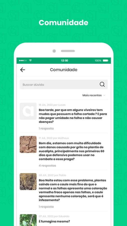 O AgroApp conta também com um espaço interativo, onde os profissionais podem enviar dicas, dúvidas e interagir com outros usuários.