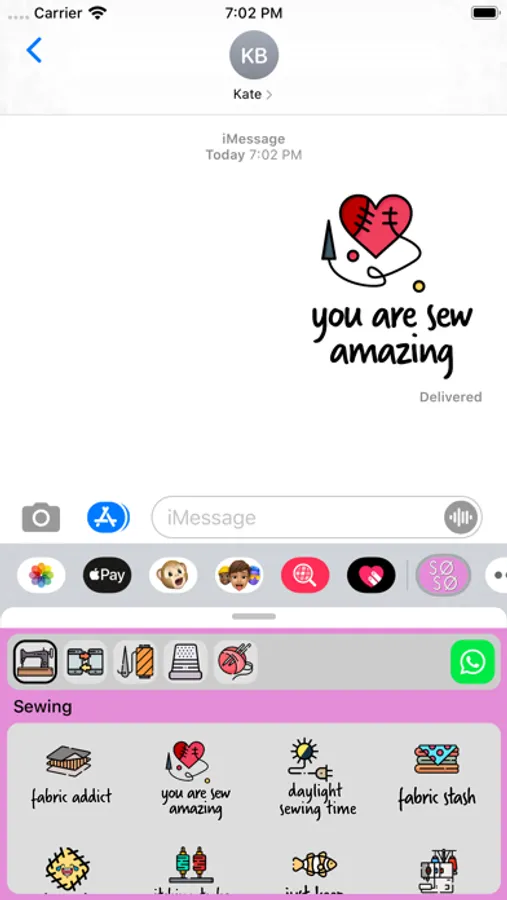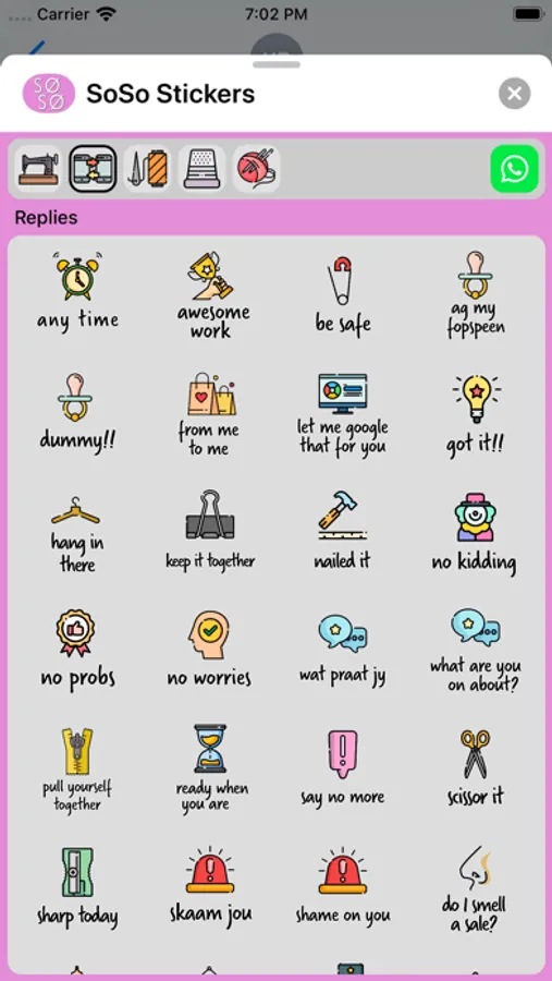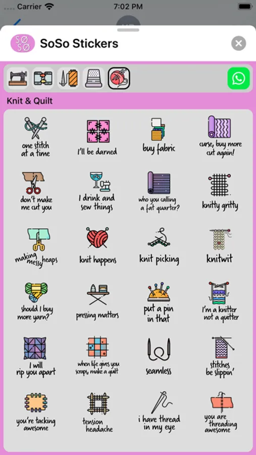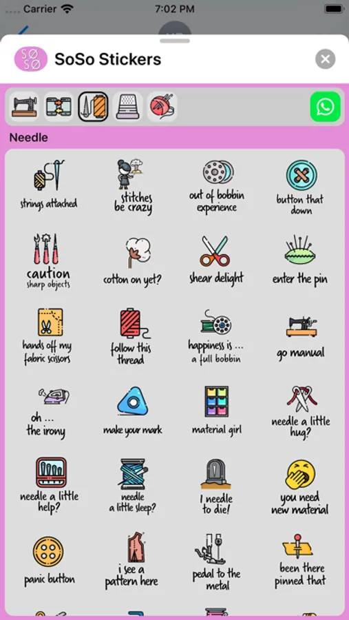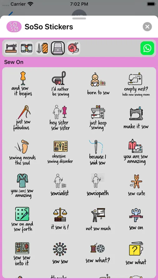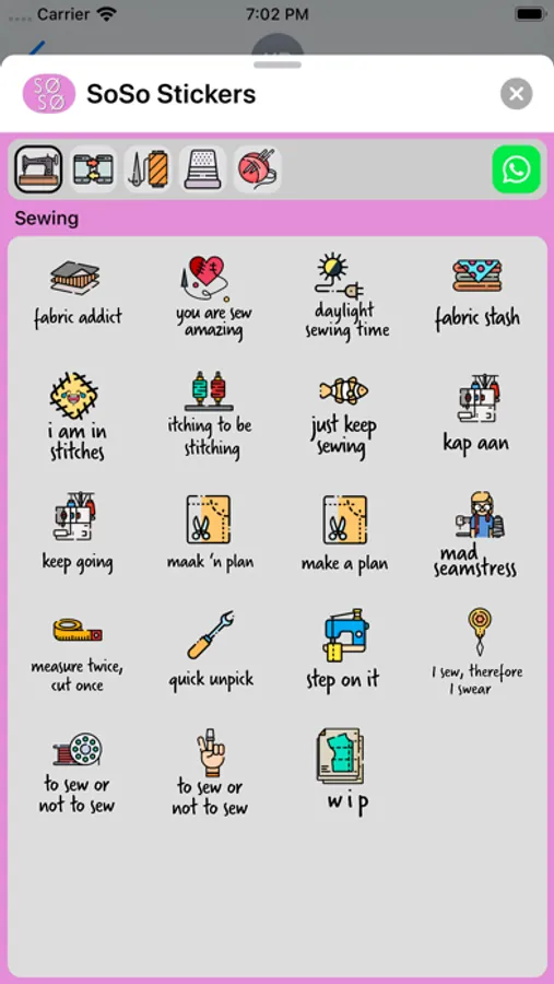 A collection of 132 sewing stickers for messaging and WhatsApp, from the So So Into It Academy.