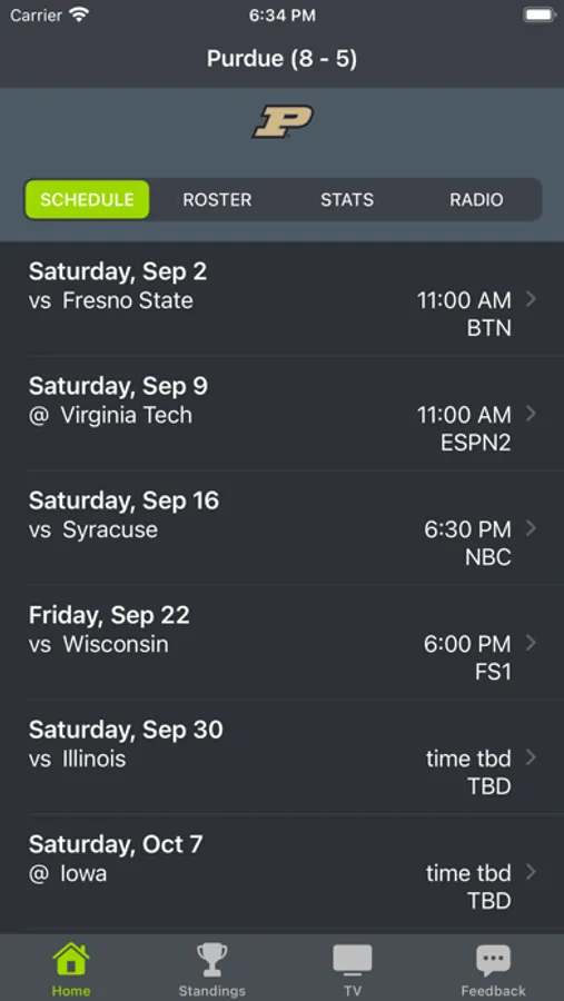 Purdue Football Schedules provides scores, links to live radio, schedules, tv channels, player profiles, and game matchups in one location.
