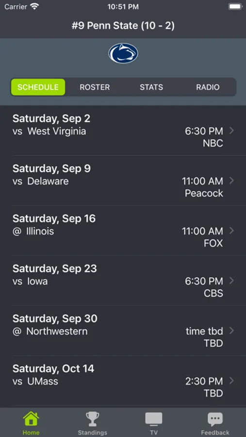 Penn State Football Schedules provides scores, links to live radio, schedules, tv channels, player profiles, and game matchups in one location.