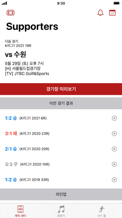 ▶ 매치 센터: 다음 경기의 일정과 장소, 라인업, 상대팀과의 이전 5경기의 결과를 한눈에 확인할 수 있습니다. 푸시 알림을 등록해 놓은 경우, 경기 전 알림과 라인업 등록시 알림도 받아 볼 수 있습니다. 또한, 위젯을 통해 다음 경기에 대한 정보를 더욱 편하게 확인할 수도 있습니다.