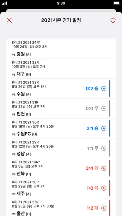 ▶ 경기 일정: 시즌 경기 일정을 제공합니다. 경기 일정과 결과를 한눈에 확인할 수 있습니다. 또한 해당 경기가 궁금하다면 바로 하이라이트를 볼 수 있는 링크까지 제공합니다. 경기 일정은 매 시즌 혹은 스플릿 라운드 경기 일정이 발표되면 실시간으로 업데이트가 됩니다.