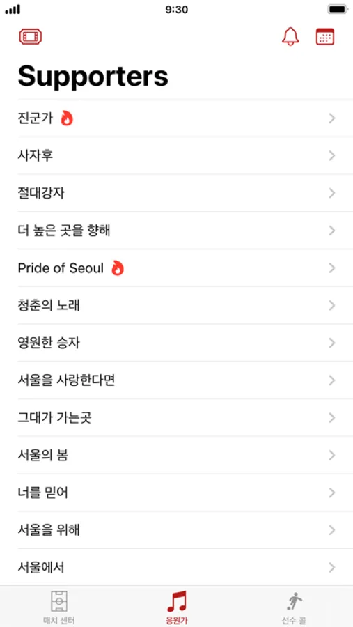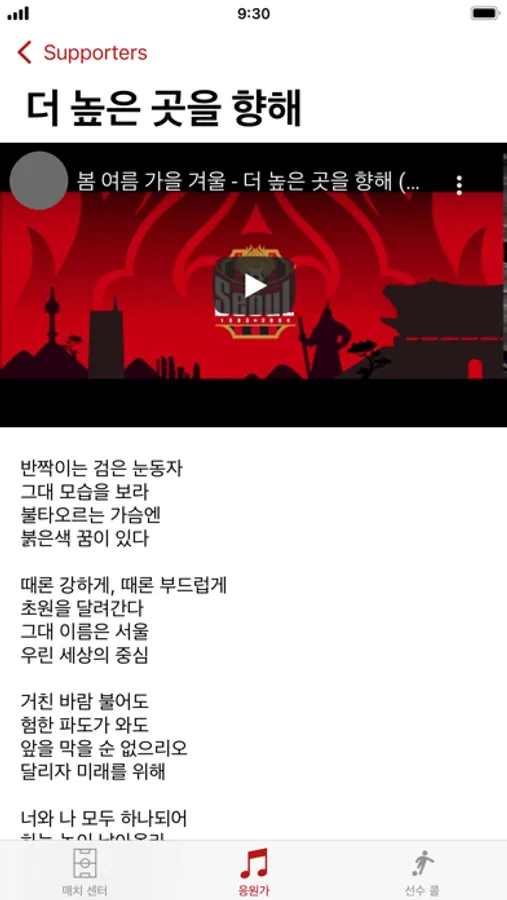 ▶ 응원가 모음: FC서울 경기때마다 부르는 응원가들을 확인할 수 있습니다. '응원가'와 '선수 콜'로 나눠져있으며, 새로 나온 응원가와 선수 콜은 실시간으로 업데이트 됩니다. 가사와 유튜브 영상을 제공하여 응원가를 들어볼 수도 있습니다.