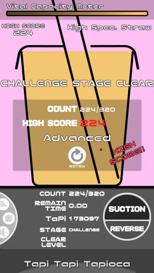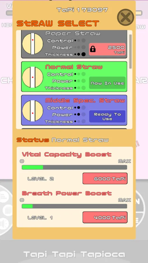 With TaPi, you can purchase straws, power up straws, unlock new stages, and continue while energy charging.