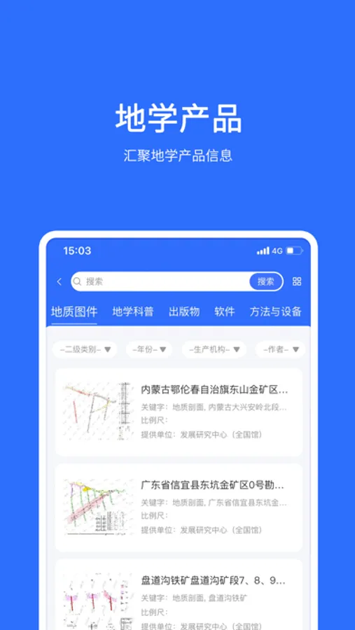 地学产品是“地质云”的常用工具。用户可以在线查询、浏览“地质云”发布的地学产品,包括由地质图件、地学科普、出版物、软件、仪器设备等各类地学产品的信息。