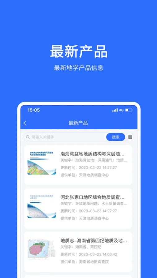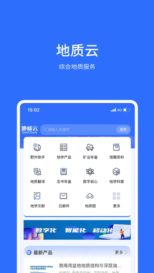最新产品是用户可以在线查询、浏览最新“地质云”发布的地学产品的功能模块,包括由地质图件、地学科普、出版物、软件、仪器设备等各类地学产品的信息。