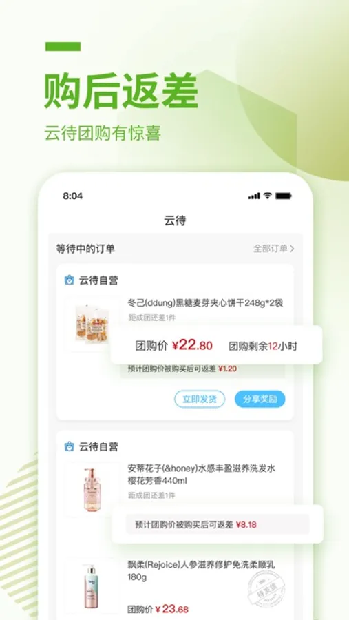 -云待商城中商品都支持多买优惠,单件商品的购买都会解锁一个价格更低的限时团购,若有人参团成功,我们将按团购价为你计算并返还差价,差价可随时提现或在下次购物使用。