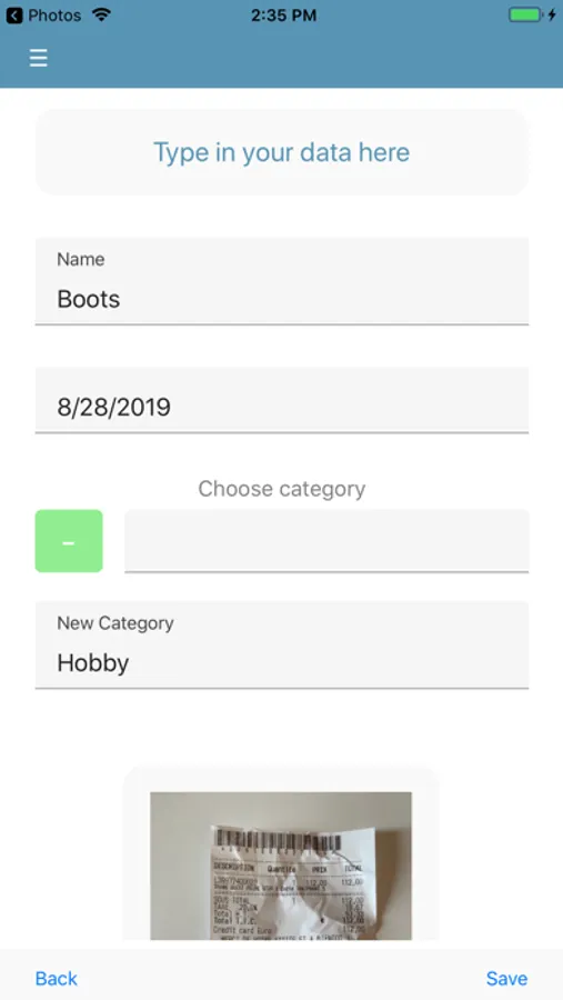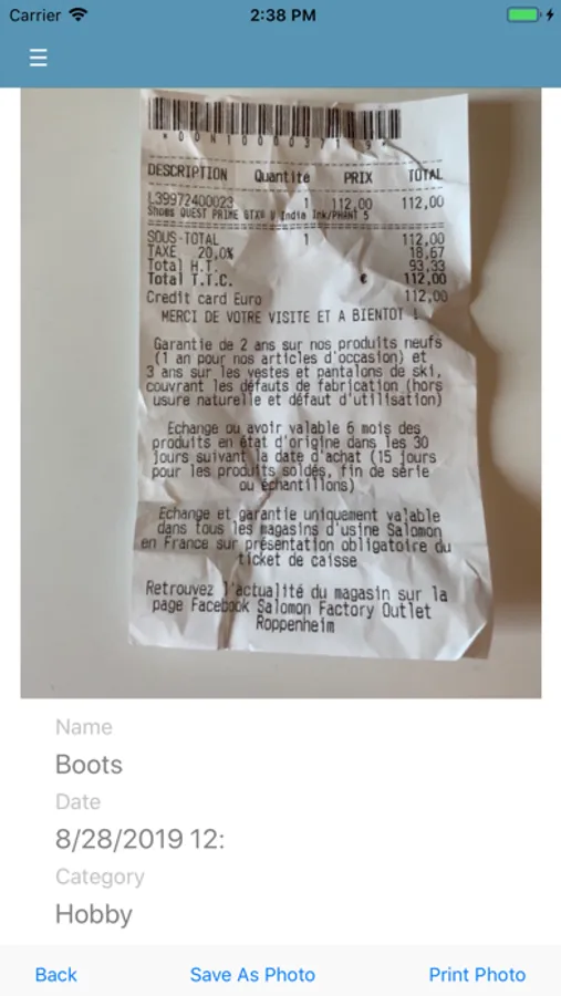 Follow 3 simple steps: 1) open the app and take a photo of your receipt / invoice / bill, 2) save it into the right category (you can also create your own category!), and 3) export it as an image into your device.