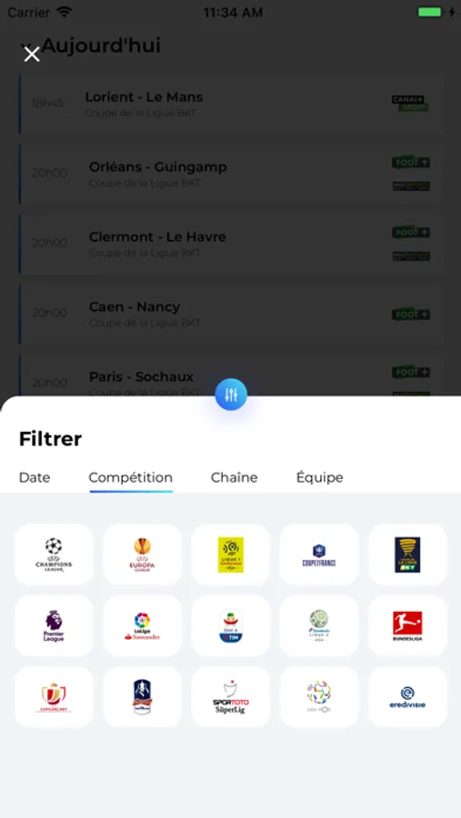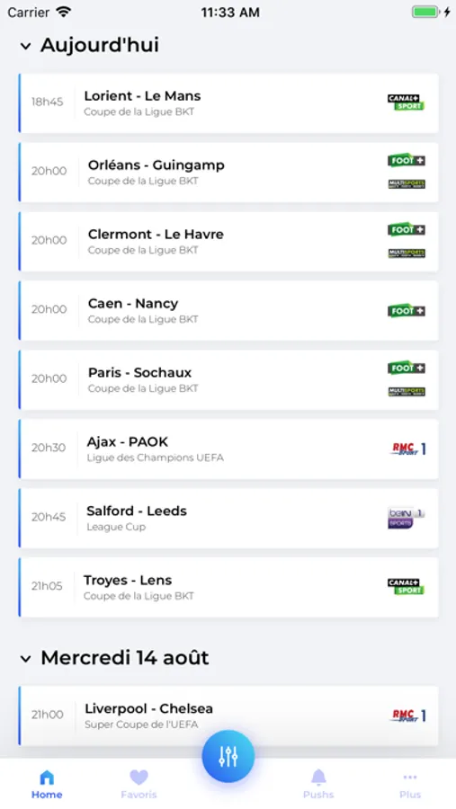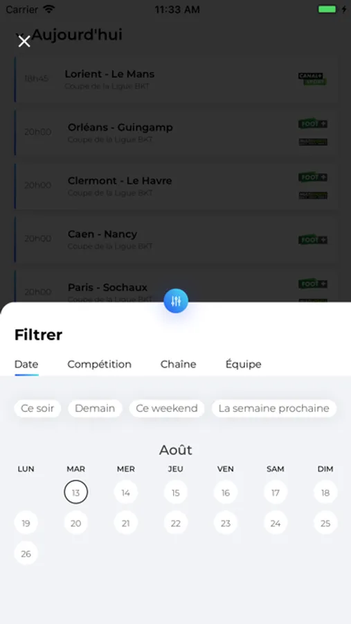 - La possibilité d’afficher uniquement les matchs diffusés sur vos chaînes TV
