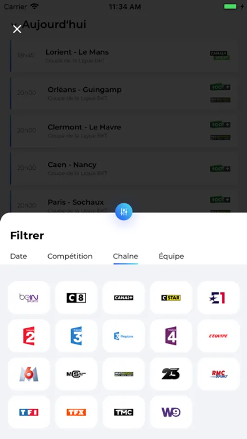 Chaînes disponibles dans cette application de programme TV foot : Bein Sport, RMC Sport, Canal +, Canal+ Sport, Foot +, Eurosport, Foot+, Multisports, Ma Chaine Sport, les chaînes TNT, TF1, France 2, France 3, France 4, M6, W9, Direct 8, BFMTV, TFX, TMC, L’équipe...