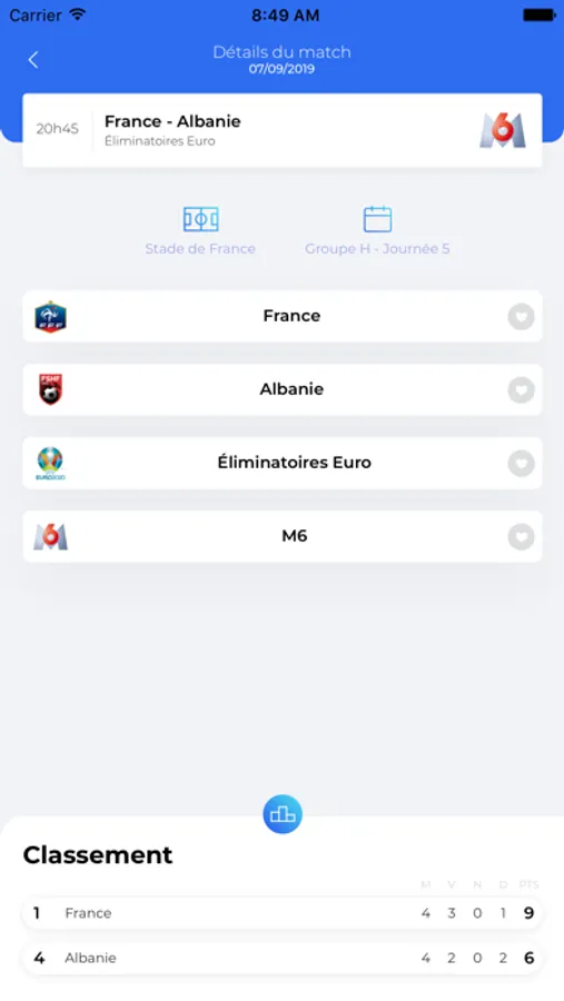 - Un affichage intuitif des matchs de football diffusés à la télévision