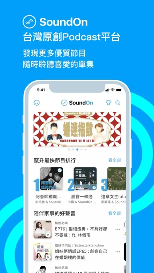 根據你的訂閱與收聽習慣,SoundOn 聲浪 將會為你量身打造,推出你可能會喜歡的 Podcast 清單。不必緩慢搜尋,因為我們永遠懂你。