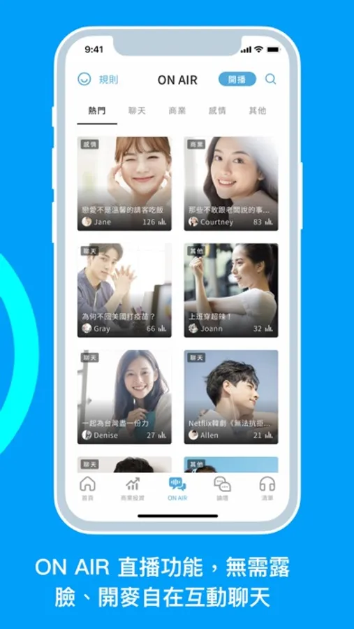 ◆ ON AIR 直播功能,無需露臉、開麥自在互動聊天。