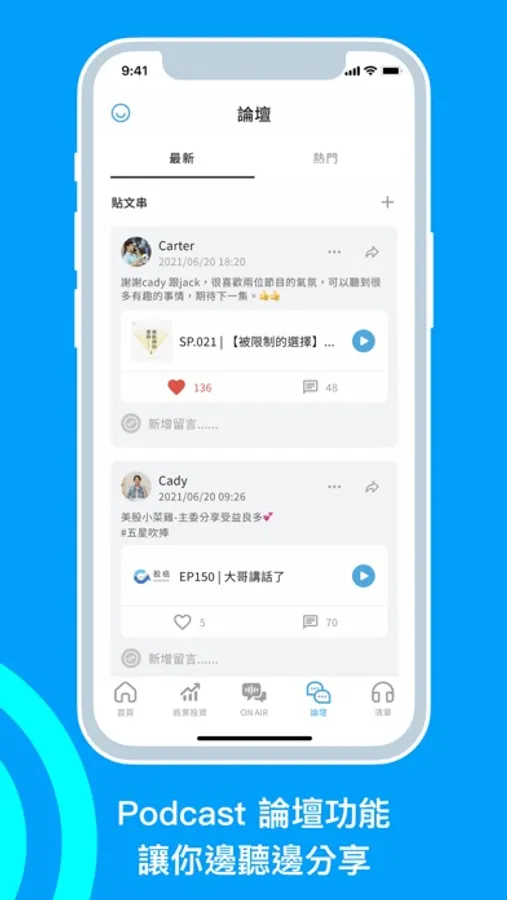 ◆ Podcast 論壇互動功能,讓你邊聽邊分享。