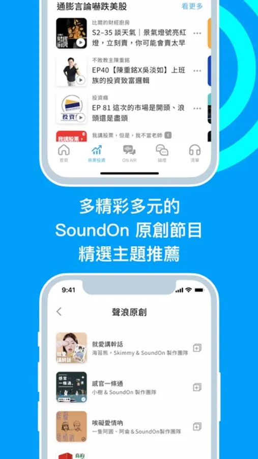 SoundOn 是一款由台灣團隊打造,匯聚網絡上所有精彩的 Podcast,並擁有自製內容團隊,定期推出平台專有 Podcast,多元主題,保證有你所愛,隨時隨地都能無限暢聽,是陪伴你生活的最佳選擇。