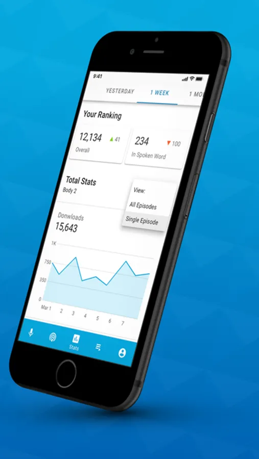 Stats - See and track your entire podcast performance anytime. Plays, Downloads, Rank and more, all at a glance.