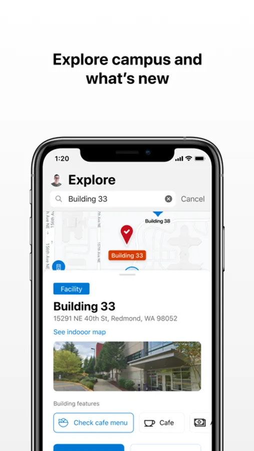 • Use indoor mapping to reach your destination, and find and book a meeting room