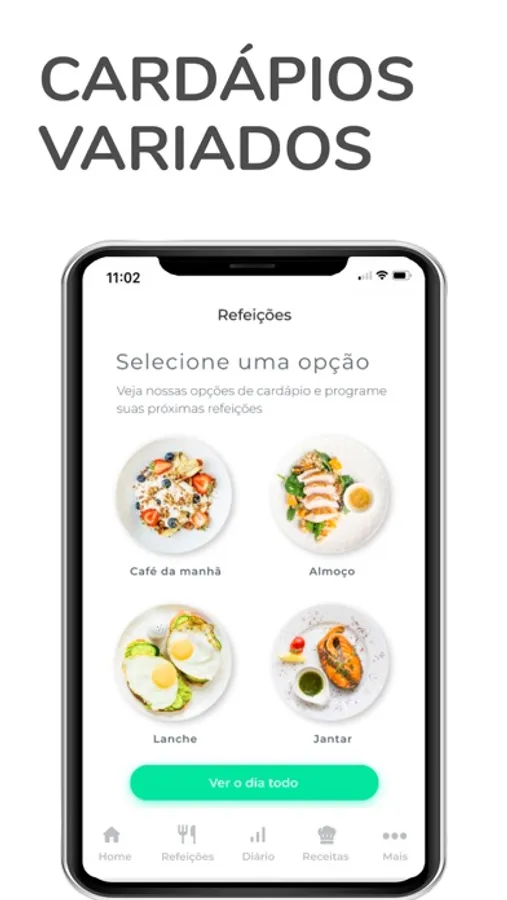 - Sugestão de cardápio com opções para comer fora de casa, receitas para quem cozinha e marmitas fit para quem opta pela praticidade