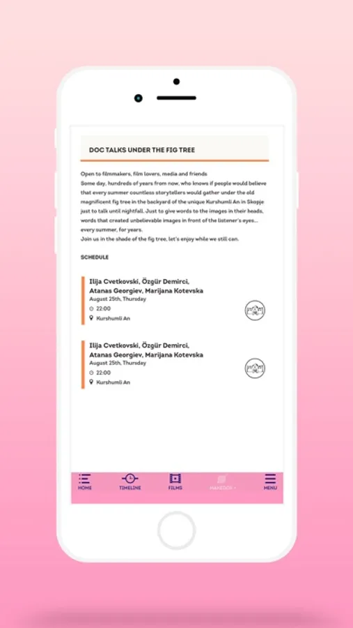 MakeDox - Creative Documentary Film Festival is a young and rarely avant-garde festival celebrating the creative documentary film. One of the most powerful catapults for creating cinema audience in Macedonia. It overwhelms, they say, with its warmth and quality. The wonderful KurshumliAn vibrates with film stories, workshops and live performances, doc-talks under a magical fig tree and music under the night sky. Out in the open, every summer since 2010.