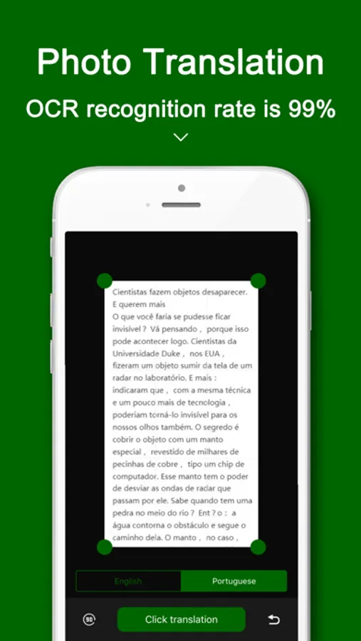 Photo translation: support Portuguese text recognition, mobile phone photo text recognition translation, efficient and accurate text extraction translation.