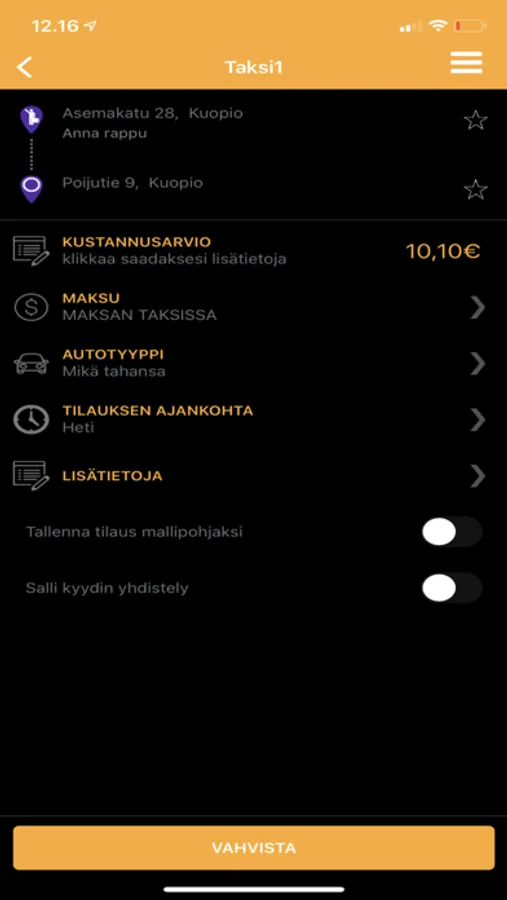 Sovellus paikantaa sijaintisi automaattisesti. Ennen tilauksen lähettämistä saat yhteenvedon tilauksestasi. Voit tarkentaa sijaintiasi kartalta, kirjoittaa osoitteesi itse, valita sen tilaushistoriasta tai omista suosikeistasi. Ilmoittamalla matkasi kohdeosoitteen, sovellus arvioi sinulle taksimatkan arvioidun hinnan. Tilauksessa voit halutessasi valita myös autotyypin ja maksutavan. Myös ennakkotilauksen tekeminen on mahdollista. Tilaus on maksuton. Mikäli haluat käyttää sovellusta kyydin maksamiseen ilman autossa suoritettavaa maksutapahtumaa voit syöttää haluamasi maksukorttien tiedot sovellukseen. Jos et halua, että taksimatkasi veloitetaan palveluun syöttämältäsi kortilta, voit valita tilauksen yhteydessä kyydin maksutavaksi ”Maksan taksissa”. Tällöin voit maksaa matkasi normaalisti autossa käteisellä tai yleisimmillä maksukorteilla.