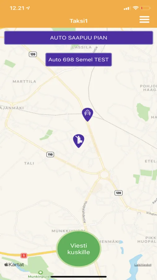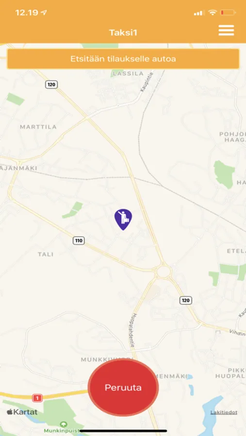 Sovellus näyttää tilauksesi tilan. Kun tilaukseesi on löytynyt vapaa auto, voit seurata auton saapumista kartalla. Sovellus kertoo sinulle myös saapuvan taksin numeron. Voit tarvittaessa lähettää sovelluksen kautta kuljettajalle lisäohjeita noutopaikkaasi liittyen "Viesti kuljettajalle"-kohdasta