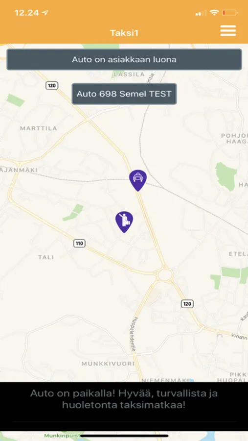 Taksin saapuessa nouto-osoitteeseen, sovellus ilmoittaa sinulle (puhelimen värinällä) taksin saapumisesta. Kuljettaja varmistaa tarvittaessa verraten tilausnumeroa sovelluksessa olevaan, että tilattu auto on juuri sinua varten.