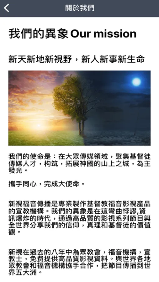 新視福音傳播是專業製作基督教福音影視產品的宣教機構。我們的異象是在這彎曲悖謬,資訊爆炸的時代,通過高品質的影視系列節目與全世界分享我們的信仰,真理和基督徒的價值觀。