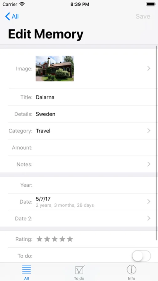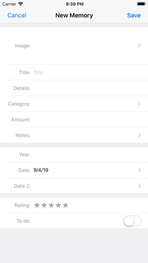 You can save memories with the following information: What, When, Image, Details, Notes and Category.