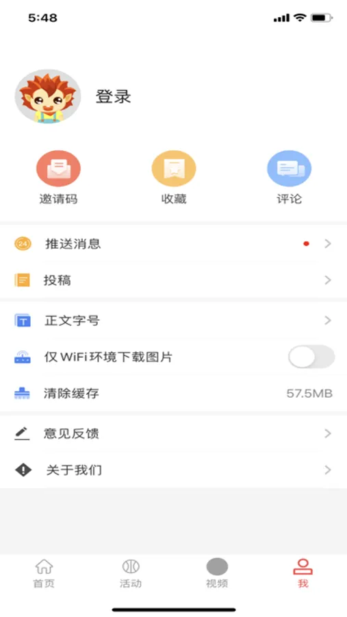 功能设置分五大板块,包括“首页”、“视频”、“活动”、“文旅”、“我”。