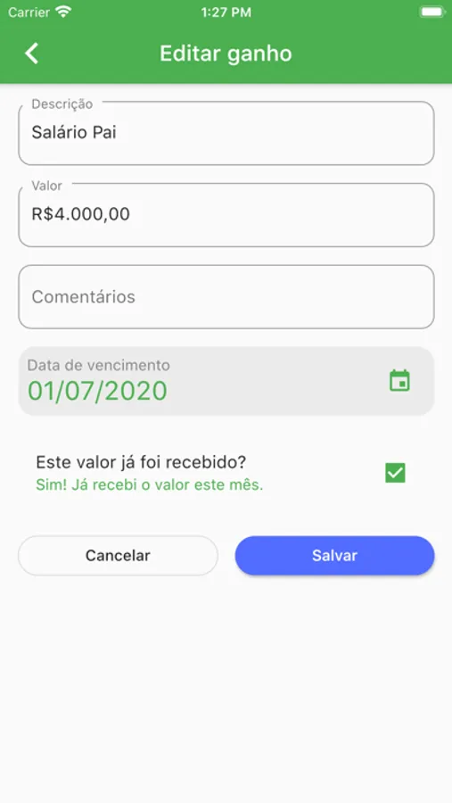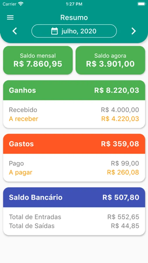 Você tem na tela inicial o resumo do seu dinheiro, ganhos recebidos e a receber, gastos pagos e a pagar, e os valores de saldo no momento e saldo estimado no fim do mês, você tem ainda o saldo das suas contas bancárias (esta função não é ligada a sua conta, você deve inserir os valores manualmente.