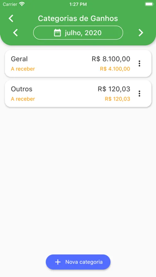 Ao clicar no cartão dos ganhos você vai pra tela de categorias dos ganhos onde você irá criar categorias para organizar os seus ganhos, dentro destas você irá adicionar os ganhos relacionados.