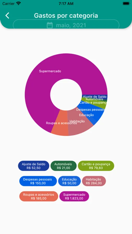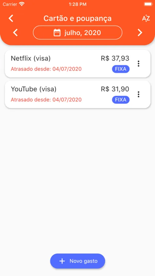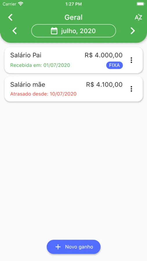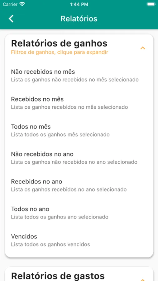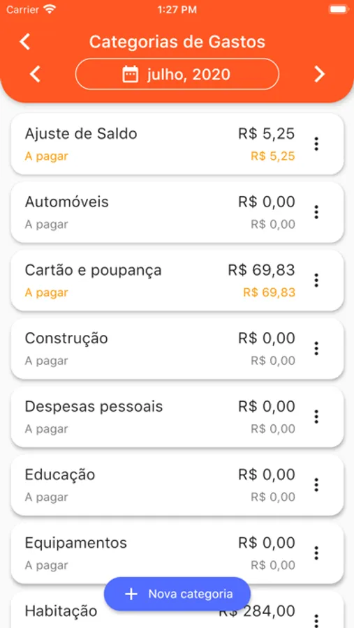 Clicando no cartão dos gastos, do mesmo modo dos ganhos, você vai para a tela de categorias onde você pode criar categorias pra organizar os gastos dentro destas.