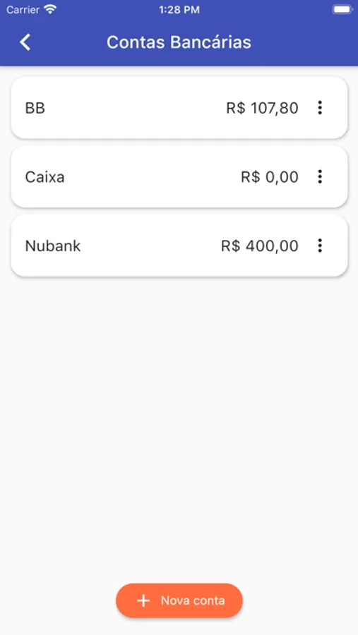No cartão contas bancárias você entra nas função de mesmo nome, onde você vai fazer o controle das suas contas, você vai adicionando os valores e o app se encarrega de calcular os totais.