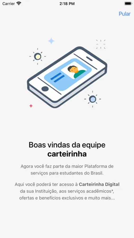 Plataforma de produtos e serviços para alunos de ensino médio, cursos técnicos e universitários. Solicitação de Carteirinha Física. Acesso à carteirinha digital da universidade. Controle de Acesso pelo Celular e muito mais...