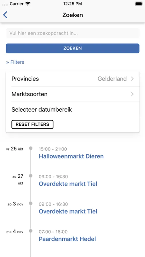 - Zoek op provincie of plaats, maar ook op dag van de week of een bepaalde datumperiode