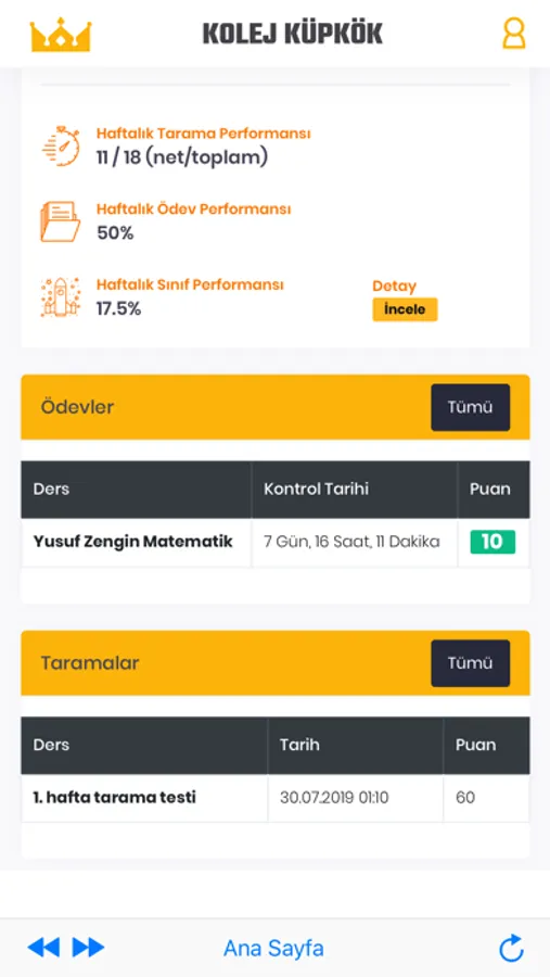 Haftalık tarama sınavlarını anlık olarak mobil uygulamadan inceleyip karşılaştırabilir.