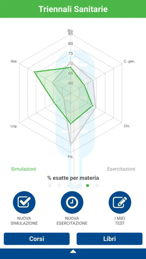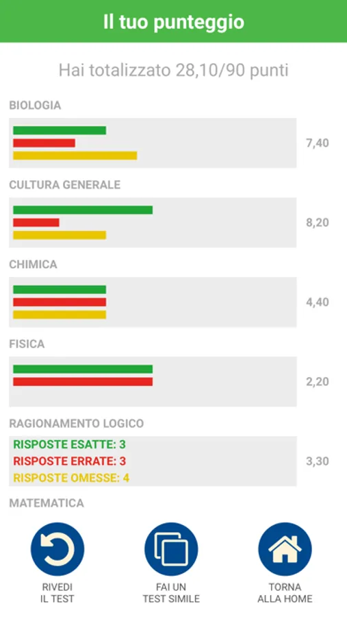 - simulazioni complete del test di ammissione, con statistiche immediate sul punteggio che hai totalizzato per ogni materia e numero di domande esatte, omesse ed errate