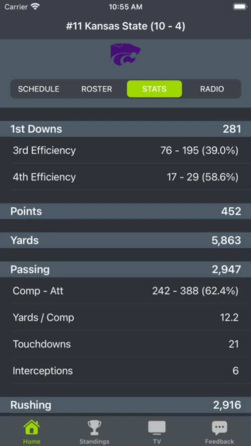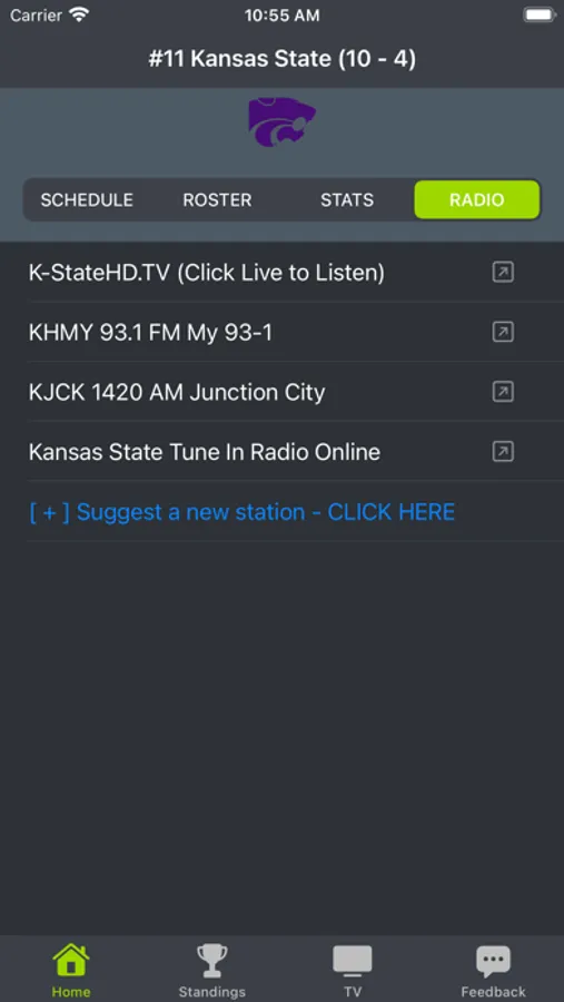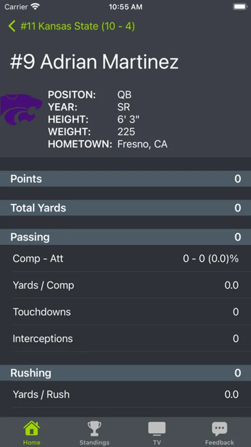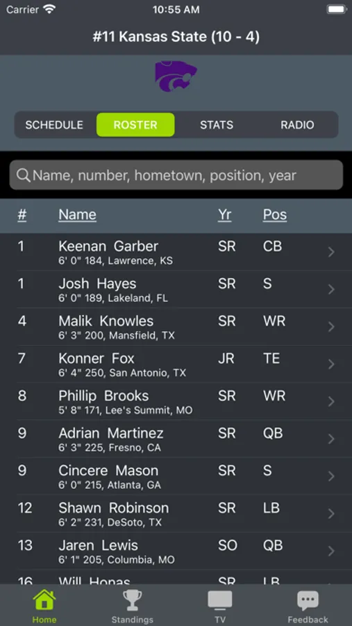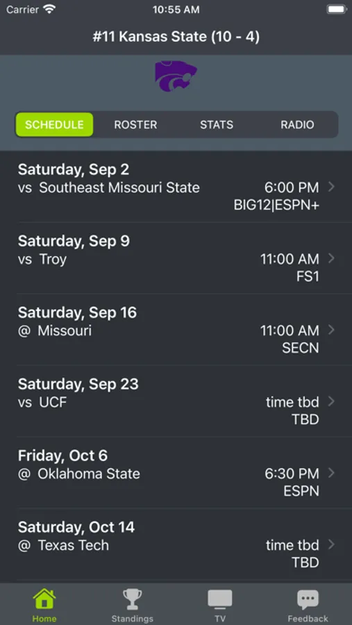 Kansas State Football Schedule provides scores, links to live radio, schedules, tv channels, player profiles, and game matchups in one location.