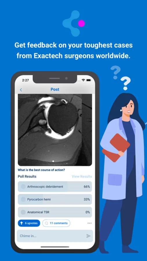 Welcome to Exactech’s world of clinical exchange and case discussions where collaboration leads to confidence. Share and receive feedback on cases based on your expertise from shoulder, hip, knee, and ankle surgeons worldwide. Chime in yourself by posing a question, launching a poll, or joining in on discussions!
