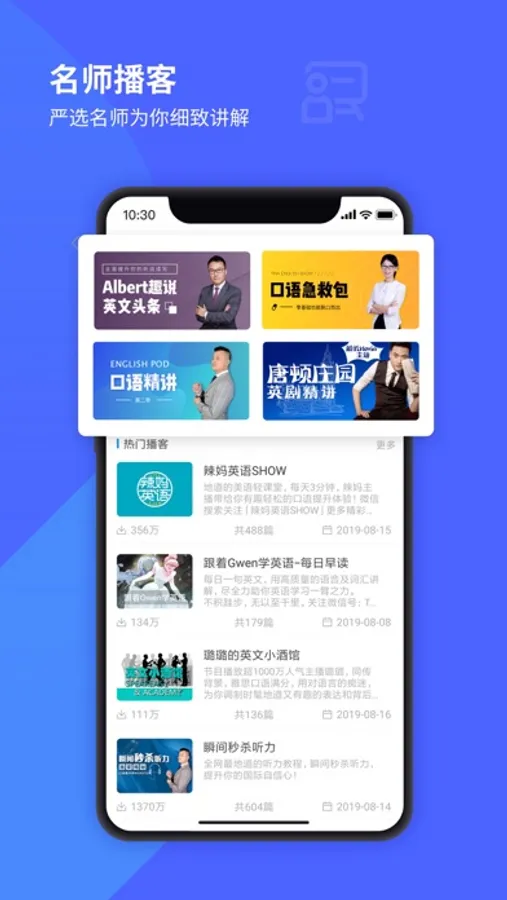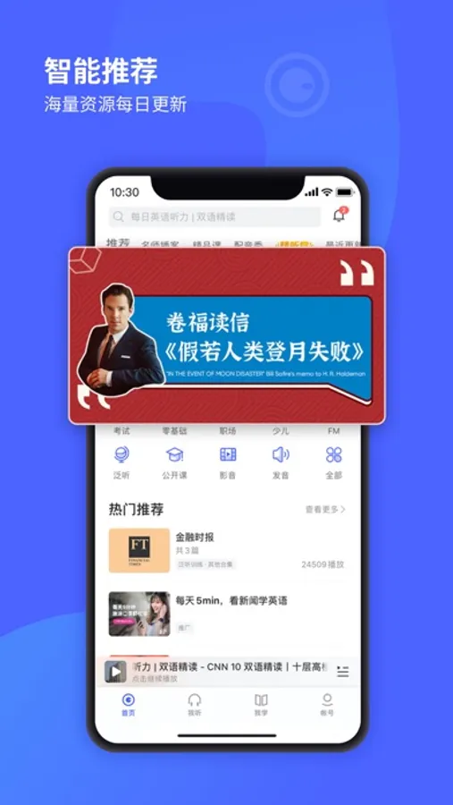 - 兴趣学习:有声读物、名人演讲、公开课、少儿英语、影视英语等丰富资源。