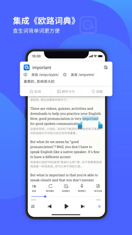 - 播放调节:8档语速调节、4种循环模式,单句精听、听写、测验,满足不同阶段的需求;