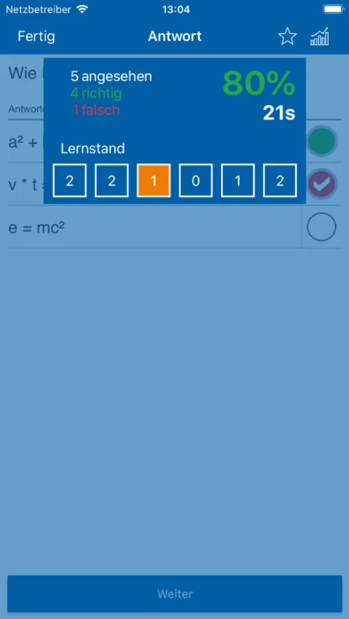 Durch das Speichern Ihres Lernstands und die Offline-Funktion der Anwendung sind Ihre Lerninhalte immer für Sie verfügbar und Ihrem Lernfortschritt angepasst. Dabei werden Sie von einem Algorithmus unterstützt, der Ihren Lernbedarf berücksichtigt, damit Sie vor allem die Inhalte lernen, die Ihnen nicht ganz so leicht fallen. Unter anderem können Sie sich auf eine bevorstehende Prüfung vorbereiten (Prüfungsmodus) oder gezielt Ihr Langzeitgedächtnis (Langzeitgedächtnismodus) sowie Ihr Kurzzeitgedächtnis (Powermodus) trainieren.