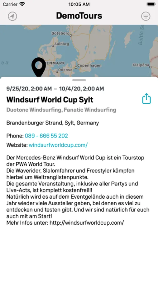 The DemoTour app shows you all upcoming Demo Events of Duotone Kiteboarding, Duotone Windsurfing, Duotone Foil Wing, Fanatic SUP, Fanatic Windsurfing, ION Bike, ION Water and SQLab on a map.