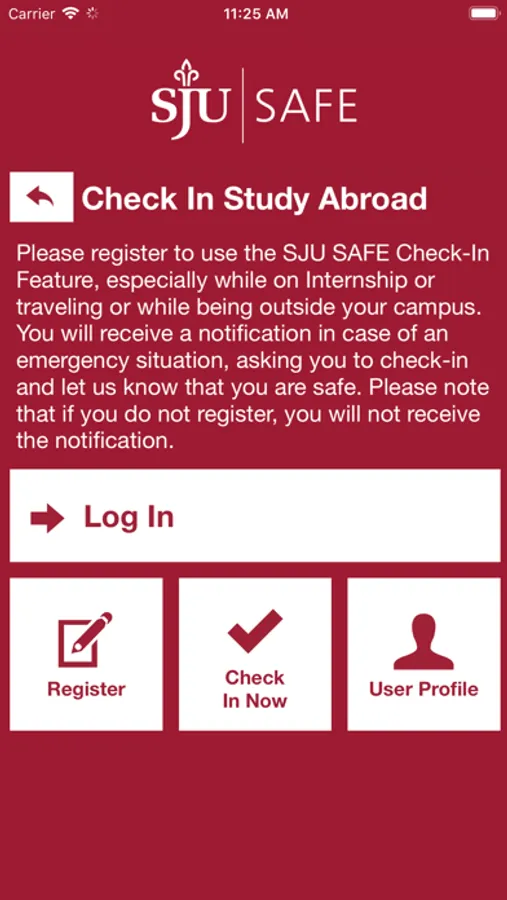 - Check In Study Abroad: In the event of an emergency situation, SJU can send out a mass Push Notification to all its app users to prompt them to Check In to indicate that they're safe.