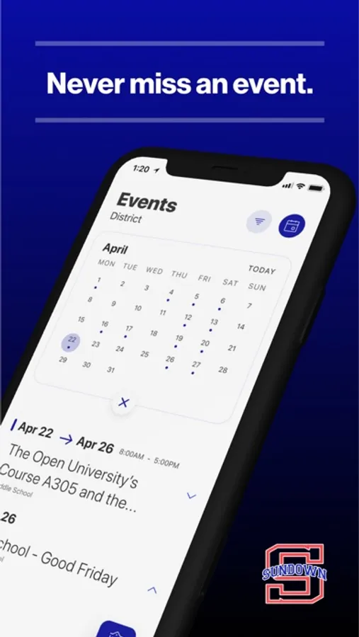 The event section shows a list of events throughout the district. Users can add an event to your calendar to share the event with friends and family with one tap.