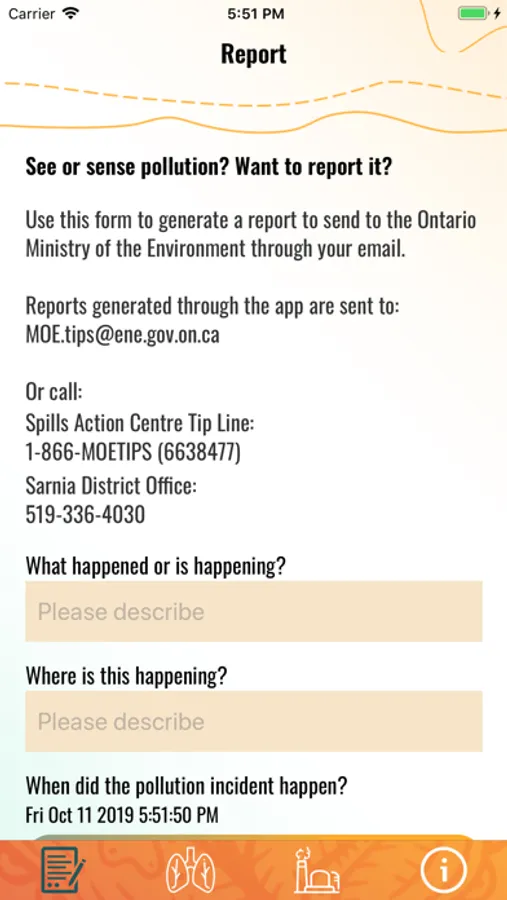 The Pollution Reporter App provides users with information that connects polluters to pollution to health harms in Ontario’s Chemical Valley. The app makes it easy for users to report spills, leaks, flares and other pollution events to Ontario’s Ministry of Environment using their phone or tablet. Users can share their reports on social media. This app is built for Aamjiwnaang First Nation community members and others living near Chemical Valley, as well as anyone who would like to learn more about pollution in Chemical Valley. This project is for educational purposes only. The health harms listed are based on findings from peer-reviewed scholarship and are not medical diagnoses. The app is built by Indigenous-led Environmental Data Justice Lab at the Technoscience Research Unit, University of Toronto.