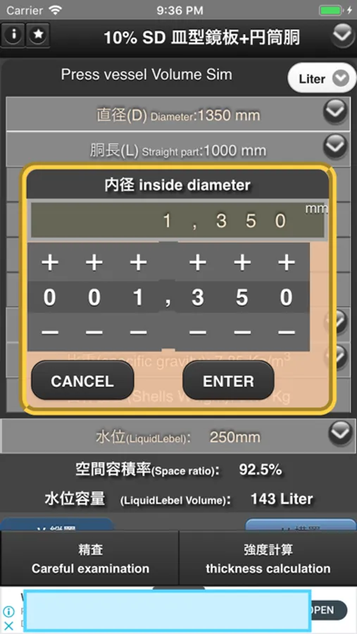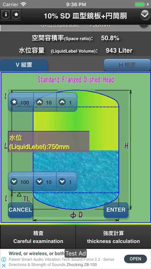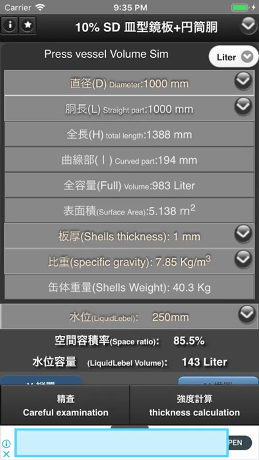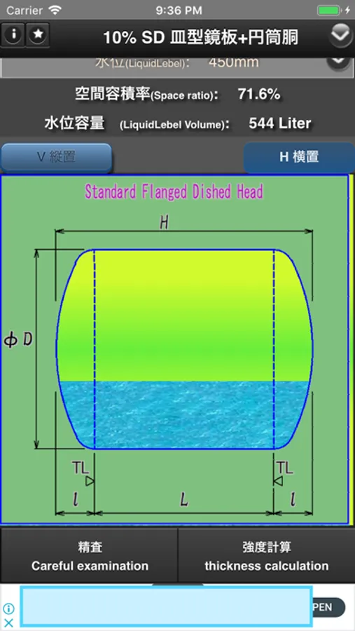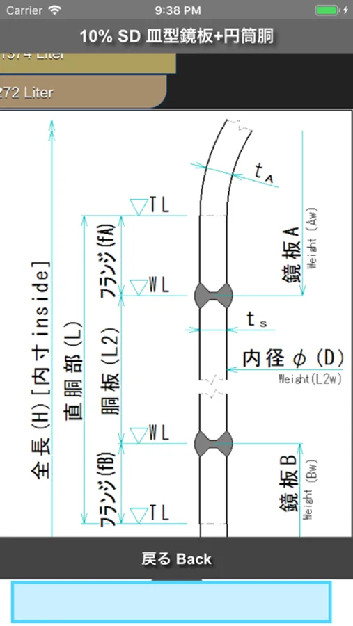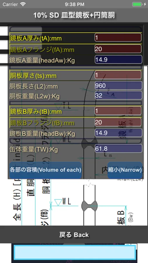 成型鏡板+円筒胴による容器の容積、表面積、設定水位における容量を求めることができるアプリです。